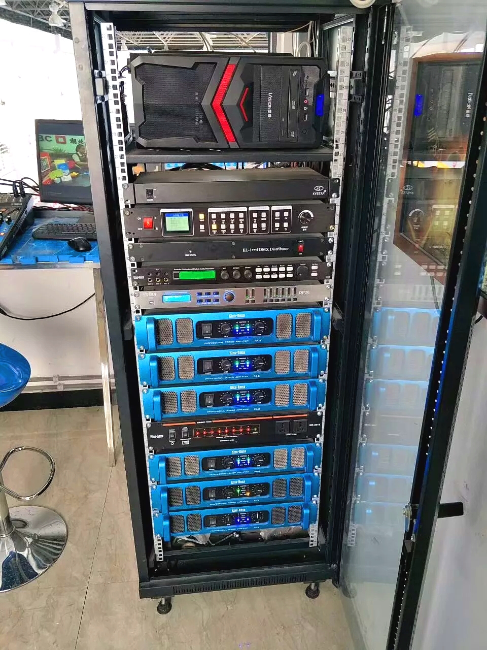 結合該體育館擴聲場所的實際擴聲需求和功能,設計應用了京邦電子(KING-BANG)的品牌,KB-15兩分頻單15"全頻箱作為主擴聲系統(tǒng),F(xiàn)-18單18"超重低音炮為整場提供良好的低頻沖擊力和量感,同時應用了京邦電子(KING-BANG)的全套周邊擴聲系統(tǒng)產品。其聲場覆蓋根據(jù)實際布局進行優(yōu)化,從而實現(xiàn)了聲場均勻、高語音清晰度和大動態(tài)的聲場。